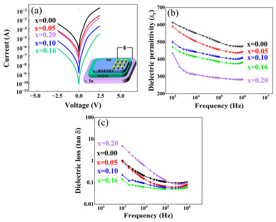 Figure 4 shows the characteristics of the leakage current versus the applied voltage (I–V) and dielectric properties of the BNFMO films. The leakage current of the BNFMO (x = 0.00~0.16) films decreased significantly with the increase in the Nd ion concentration, as shown in Figure 4a. The inset of Figure 4a shows the structure of the device used for the measurement. The reduction in oxygen vacancy content and other impurity defects leads to poor local conductivity, which is consistent with other reports reducing oxygen vacancy concentration by replacing a volatile Bi ion with a nonvolatile Nd ion. However, due to the excessive doping, there are more defect charges with the Bi0.80Nd0.20Fe0.99Mn0.01O3 thin film; thus generating an increase in leakage current compared to Bi0.84Nd0.16Fe0.99Mn0.01O3 film [44]. Figure 4b illustrates a systematic reduction in dielectric permittivity (Ɛr) of BNFMO (x = 0.00~0.20) films with Nd-doping [42] at high frequencies, which is attributed to the polarization relaxation phenomenon. It can be ascribed to fact that the contribution of interfacial, dipolar, ionic, and atomic polarizations decreases with increasing frequency and finally vanishes (except electronic polarization) at extremely high frequencies [45,46]. The Ɛr of the Bi0.80Nd0.20Fe0.99Mn0.01O3 thin film reduced drastically at a low frequency, but this phenomenon is absent on the BNFMO (x = 0.00, 0.05, 0.10, 0.16) thin film, thereby indicating more defect charges in the Bi0.8Nd0.20Fe0.99Mn0.01O3 film, such as Fe2+. Meanwhile, the increase in the doping amount of Nd ion tends to decrease the dielectric permittivity of the BNFMO (x = 0.00~0.20) thin films at low frequency, and the dielectric permittivity is 612, 589, 499, 471, and 435 at 1 kHz, respectively, which is increased from the decrease in grain size and the reduction in space charge polarization and conductivity of the sample [47,48]. Significantly, the Bi0.8Nd0.20Fe0.99Mn0.01O3 film shows the highest dielectric loss (tan δ) at low frequency as shown in Figure 4c. The increase in the tan δ and decrease in the Ɛr of Bi0.8Nd0.20Fe0.99Mn0.01O3 film indicates the strong dielectric relaxation behavior in film [16].