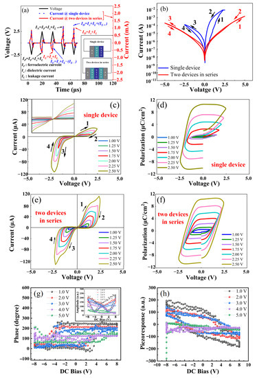 In this study, in order to deduct the influence of the RS effect during the PUND measurement, the PUND measurement was carried out for BNFMO (x = 0.00~0.20) connected in series with single and back-to-back connected two identical 40-nm-thick BNFMO ferroelectric capacitors, respectively. Firstly, we selected Bi0.84Nd0.16Fe0.99Mn0.01O3 film to study the two different measurement approaches. Figure 5a shows the PUND measurement on Bi0.84Nd0.16Fe0.99Mn0.01O3 film of a single device and two devices in series at 10 kHz. The inset shows the structure for two different measurement methods. The corresponding I–V and P–V loops of two different measurement methods were calculated from the blue and red lines of (a), respectively, as shown in Figure 5c–f. Obviously, as can be seen in Figure 4c,d, the abnormal I–V and P–V loops were observed, but Figure 5e,f demonstrates the symmetrical loops. Furthermore, we measured the DC I–V curves of two different approaches to verify the PUND results. The voltage was applied in the order of 0 V → +5 V (2.5 V) → 0 V → −5 V (−2.5 V) → 0 V, as shown in Figure 5b. The observed results of PUND and DC I–V curves indicate that the structure of two devices in series can reduce the RS effect effectively. When we measure the ferroelectric hysteresis loop, the maximum range of the test instrument is −5 to +5 V. Thereby, if the two devices in series technique is used, the measurement range is only −2.5−2.5 V, which will lead to the P–V loop we measured being unable to reach saturation polarization [52,53]. Hence, further measurements were undertaken to verify the ferroelectric properties of the Bi0.84Nd0.16Fe0.99Mn0.01O3 film. For ferroelectric material, the piezoresponse (PR) hysteresis loop is expected to deform and even collapse when Vac is above the coercive voltage because the polarization switching counteracts the PR [54,55]. The phase, amplitude, and PR of the Bi0.84Nd0.16Fe0.99Mn0.01O3 film were measured to verify the ferroelectric properties. This behavior is observed on the Bi0.84Nd0.16Fe0.99Mn0.01O3 film in Figure 5g,h. This result indicates that Bi0.84Nd0.16Fe0.99Mn0.01O3 thin films exhibit true ferroelectric properties.