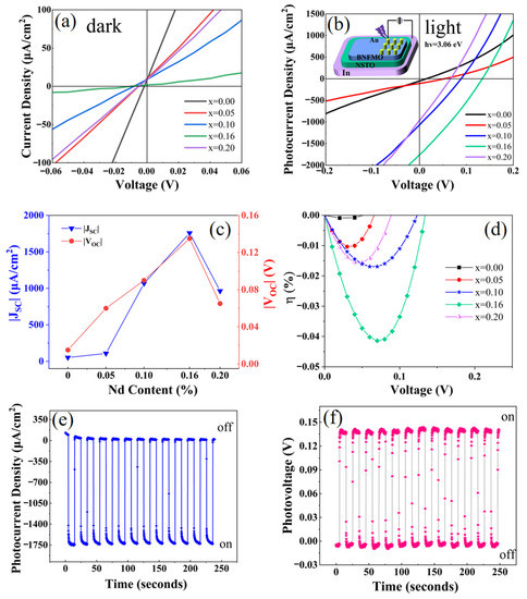 (a) J–V curves of ferroelectric photovoltaic devices in darkness. (b) J–V curves of ferroelectric photovoltaic devices under illumination. The inset shows the Au/BNFMO (x = 0.00~0.20)/NSTO/In structure diagram of the ferroelectric photovoltaic device. (c) The change in the JSC and VOC with Nd-doping amount. (d) Corresponding voltage dependence of light-to-electricity power conversion efficiency (η) for BiFe0.99Mn0.01O3 film with different Nd3+ contents. (e,f) The time dependence of the photocurrent density and photovoltage of Bi0.84Nd0.16Fe0.99Mn0.01O3.