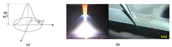 Here, ht is the convection heat-transfer coefficient, Ts is the surrounding temperature, σ is the Stefan–Boltzman constant and ε is the surface emissivity. Values of ε = 0.7 and ht= 242 Wm−2 K−1 to include forced convection in the area directly beneath the nozzle of the laser heat source were used. Convection heat loss at the workpiece top surface and all the other weldment surfaces were also accounted for using a value of ht = 10 Wm−2K−1. The heat input q(x,z,t) from the heat source to the workpiece is represented by a moving Gaussian power density distribution (Figure 1a and Equation (3)) applied over the top surface of the specimen during a period of time that depends on the welding speed (v). The characteristic heat distribution parameter, C, was selected based on previous experimental measurements of the fusion zone and heat-affected zone widths [17]. The mentioned parameter is very important because the shape and distribution of the heat input from the heat source greatly depend on its value. A distribution parameter C = 4.5 mm was used in all the simulations. The Gaussian distribution model is usually used in simulations of welding processes with high power densities, i.e., arc, laser, or electron beam welding. With the help of this heat source model, in which energy is distributed according to a Gaussian profile, it is possible to map deep penetration, while maintaining a small width, characteristic of “keyhole” welding techniques [18].