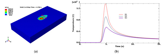 (a) An autogenous laser weld performed in a macro mesh of 40 × 10 × 75 mm and (b) thermal cycles at documented N1, N2 and N3 locations. Element size 1 mm.