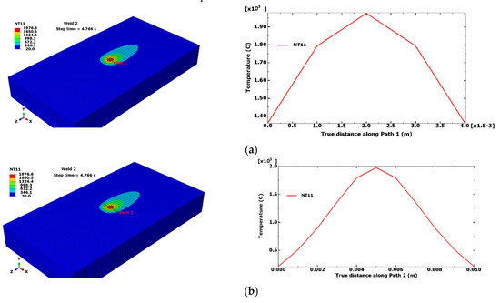 (a) Temperature distribution along Path 1 of 4 mm length and (b) temperature distribution along Path 2 of 10 mm length. Values obtained at the step time 4.766 s. Element size = 1 mm.