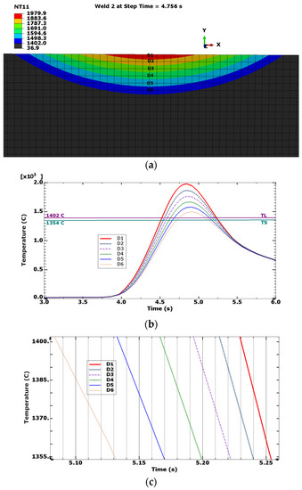 Figure 7 shows a meso weld-pool cross-section, thermal cycles and cooling rates at six reported locations. The liquidus (TL) and solidus (TS) temperatures are also shown. For AISI 310 steel, the liquidus and the solidus temperatures are 1402 °C and 1354 °C, respectively [25]. Figure 7c reveals high cooling rates (through the solidification temperature range) in the points located at the meso fusion zone ranging from 960 °C/s at point D6 to 2400 °C/s at point D1.
