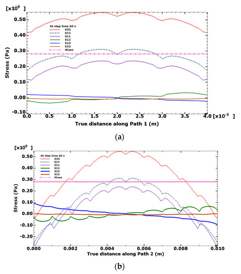 Figure 8 shows the meso-level residual stresses (normal, shear and mises) at a cooling time of 60 s along Paths 1 and 2 (see the paths in Figure 5 and Figure 6). The maximum observed value of 520 MPa corresponds to the normal stress S33 that follows the direction of the heat-source speed (longitudinal axes Z or 3). These high values explain the evolution of the distortion of the fusion zone due to the welding process. Macro residual stresses are commonly calculated with the finite element method using macro grids. However, rough residual stress profiles are commonly plotted due to the scarcity of numerical points. In the proposed meso model, as a fine mesh is used, smoothed profiles of residual stresses can be better graphed, as shown in Figure 8.