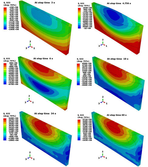 Evolution of the meso-level residual stresses (S33) at documented step times.