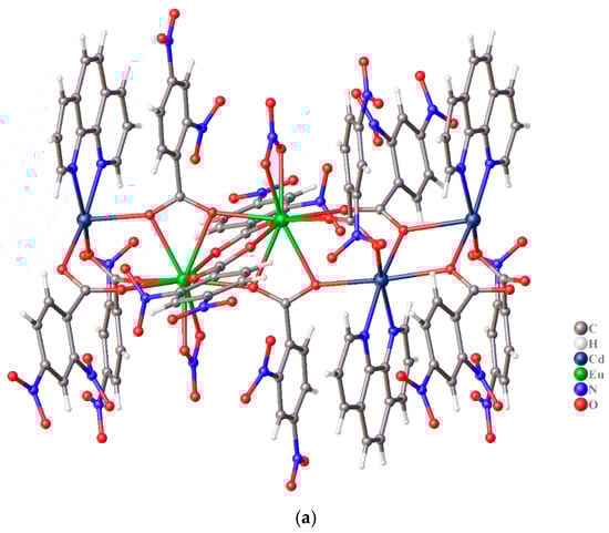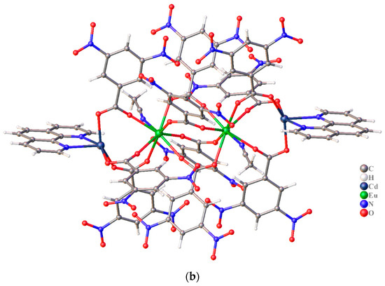 In molecular complex II, the central europium ions are bound to each other and to terminal cadmium ions by μ2κ1κ1- and μ3κ1κ1κ1-3,5-Nbz anions to form a tetranuclear linear Cd-Eu-Eu-Cd metal fragment where the metal atoms lie in the same plane (Figure 1b). The cadmium coordination polyhedron in compound II best fits a capped trigonal prism (Figure 2b, Table S2, CdO4N2) formed by two chelate-bridged and one bridging 3,5-NO2 anions and completed by two nitrogen atoms of 1,10-phenanthroline (Figure 1b). The europium coordination environment in compound II best fits a square antiprism (Figure 2b), Table S2, EuO7N) formed by oxygen atoms from seven bridging 3,5-NO2 anions and completed by a nitrogen atom of the acetonitrile molecule. In the literature there are examples of “small” solvent molecules bound by lanthanide atoms in similar heterometallic carboxylate complexes [30,31,32,33,34], however, in most compounds, rare-earth ions complete their environments by O-donor ligands.