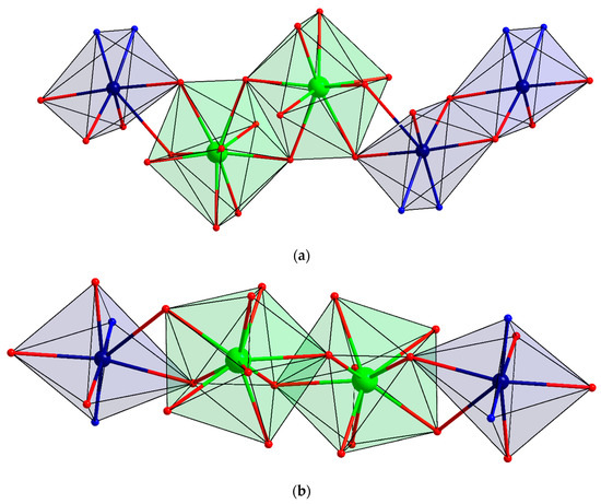 Single crystal X-Ray diffraction experiments with I and II were done on a Bruker D8 Venture diffractometer (Bruker, Billerica, MA, USA) with a CCD camera and a graphite monochromated MoKα radiation source (λ = 0.71073 Å). Semiempirical absorption corrections were applied for all the experiments using SADABS [26]. Direct methods were used in structure solving. The refinement was done by the full-matrix least squares technique in anisotropic approximation for all non-hydrogen atoms. The H atoms were calculated geometrically and refined in the riding model. The calculations were performed in SHELX [27] using Olex2 [28]. The SHAPE 2.1 software [29] was used to determine the metals polyhedrons geometry. The most important experimental crystallographic data and refinement statistics for I and II are reported in Table S1. Supplementary crystallographic data for the compounds synthesized are given in CCDC numbers 2103445 (for I) and 2103442 (for II). These data can be obtained free of charge from The Cambridge Crystallographic Data Centre via www.ccdc.cam.ac.uk/data_request/cif (accessed on 2 February 2022).