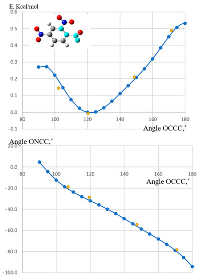 Quantum-chemical analysis of the dependence of energy on the angle of rotation of the carboxyl group in 2,4-dinitrobenzoate. Above—energy dependence, below—ONCC angle dependence.