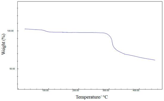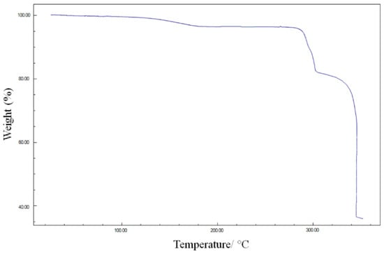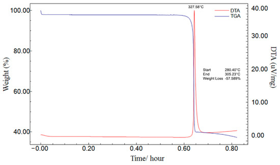 TGA and DTA analyses was performed for [Eu2(NO3)2Cd2(Phen)2(2,4-Nbz)8]n·2nMeCN (I). Figure 4 shows a small weight loss process that starts at 116 °C, ends at 165 °C, and is accompanied by 2.9% weight loss. It is attributed to the loss of solvate acetonitrile molecules (Calc. 2.9%). The main decomposition occurs at 267 °C with 57% weight loss. The DTA curve shows an exothermic process with a max peak temperature of 328 °C (Figure 5). The difference in Figure 4 and Figure 5 is due to registration with a sharp increase in temperature as a result of the exothermic effect. In this case, Figure 5 will be more indicative, which shows the dependence of the mass on time, and not on temperature, which makes it possible to more correctly show the change in the mass of the sample.