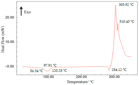 As shown in Figure 7, compound II shows an endothermic broad peak around 97.91 °C corresponding to the a loss of coordinated acetonitrile molecules, which starts at 84 °C and ends at 110 °C. An intense exothermic process is observed from 295 °C to 310 °C, with the peak temperature of 303.92 °C, which indicates the main decomposition reaction with explosion of the sample.