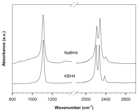 The ATR spectra of as-received NaBH4 and KBH4 powders are shown in Figure 1. The positions of the peak maxima are in good agreement with values reported by Renaudin et al. [32] as collected in Table 2 together with the assignment given. It is well known that the bands in the ATR spectra are generally shifted to lower frequencies compared to the transmission spectra due to the dispersion of the refractive index. This is one reason that the IR peak positions obtained using the standard pressed pellet technique, e.g., in KBr halide shows deviations from peak positions determined using ATR.