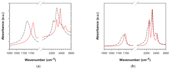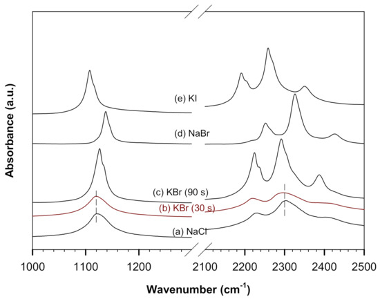 It has been reported that the BH4− anions are highly diluted in AX by heating discs constituted of AX and traces of borohydride (NaBH4 or KBH4) to temperatures between 500 and 600 °C [49]. For our purpose, this effect is demonstrated in Figure 3. Shown are spectra for NaBH4 (1 mg) diluted into 200 mg of NaCl and KCl (dashed curves) compared to those after heating to 450 °C (red solid lines). For NaBH4 in NaCl after the thermal treatment, the IR peaks appeared to be sharpened and shifted to higher wavenumbers compared to spectra taken before the heating. For NaBH4 diluted and pressed with KCl, the spectrum shows peak splitting indicating the formation of two types of solid solution with a higher and smaller BH4− anion concentration in KCl. However, after thermal treatment, a more homogeneous dilution of BH4− anions in KCl crystals is obtained.