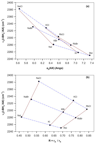 It is observed that ν3(i-BH4−) is similar in NaI and RbBr, 2281 and 2279 cm−1, respectively, while the corresponding a0 (6.479 Å and 6.877 Å, respectively) and ion radius ratio R (0.4636 and 0.7755, respectively) of the halide matrices are very different. Therefore, the frequencies of ν3(i-BH4−) cannot be interpreted in terms of only the lattice parameter a0 or R determining the available space for the substituting BH4− in AX. At variance, the IR frequencies of i-BH4− are dependent on the nature of the host matrix, as suggested in previous works for many polyatomic ions isolated in halide matrices [30,50,]. To show this effect more clearly, graphical representations of ν3(i-BH4−) as a function of the structural parameters, a0 and R of the corresponding AX, are given in Figure 4a,b, respectively.