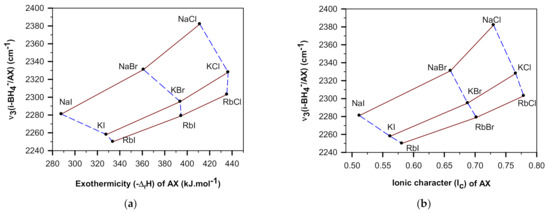 The interrelations established between ν3(i-BH4−), a0(AX) and R(AX) can be extended and discussed in term of other parameters of AX as the negative value of the standard enthalpy of formation (ΔfH, or exothermicity = −ΔfH), the fractional ionic character of the bond for AX (Ic) and the electronegativity χP of A and X, respectively. It has been reported that -ΔfH increase with increase of Ic of AX. Moreover, both parameters increase when R increases within a given A-series (rX is changing) or X-series (rA is changing) with the increase being deeper for A-series [51]. By combining these correlations with those deduced from Figure 4, it can be deduced that for the same cationic A-series, ν3(i-BH4−) is positively correlated to -ΔfH and Ic of AX, i.e., an increase of ν3(i-BH4−) is accompanied with an increase of -ΔfH and Ic of AX, respectively (Figure 5). For the homologous series with the same anionic element, an inverse correlation lies between ν3(i-BH4−) and -ΔfH and Ic of AX, i.e., an increase of ν3(i-BH4−) is accompanied with a decrease of -ΔfH and Ic of AX, respectively.