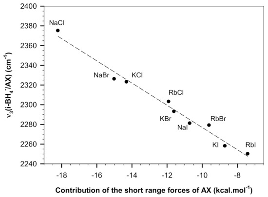 An approximately linear relation is obtained between ν3(i-BH4−) and the short-range lattice energies of AX (Figure 6). The short lattice energy of AX can be considered as the contribution of the repulsive, dipole–dipole and dipole–quadrupole interaction energies given by the Born–Mayer equation AX. These values are tabulated in Table 5 and make clear evidence that the repulsive forces constitute the major part. Similar linear correlation was reported for the nitrate anion NO3− embedded in different halide matrices [55]. We also obtained the same linear dependency for CN− in different halides basing on the IR frequencies of reference [54].