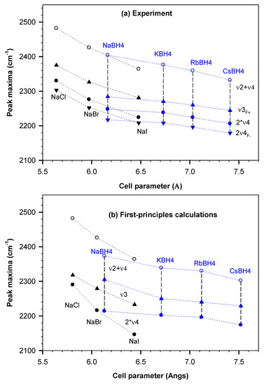(a) Experimental peak positions of v4 expressed in the term of 2*v4, 2v4F−, v3F+ (F−, F+ denotes the Fermi−resonance effect) and v2 + v4 of i-BH4− in NaX, X = Cl, Br, I and MBH4 (taken from Renaudin et al. [32]) as a function of the cell parameter a0. (b) Calculated (first principles) peak positions of BH4− anion in Na(BH4)0.25X0.75 with X = Cl, Br, I and MBH4, M = Na, K, Rb, Cs as a function of calculated unit cell parameters.