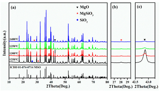 Figure 1 shows the XRD patterns of the MSO powders calcined at different temperatures. As can be seen from Figure 1a, the MSO phase (ICDD 01-074-0714) was discovered in all the samples, combined with the secondary phases identified as MgSiO3 and MgO, which decreased with the increase in calcining temperature, as shown in Figure 1b,c. The SiO2 phase was detected when the powders were calcined at 1250 °C, while there was no SiO2 phase when the powders were calcined at temperatures more than 1250 °C. Thus, it was too troublesome to obtain the composition of the pure MSO phase by the conventional solid-state method, as the MgSiO3 phase and residual MgO phase always emerged, induced by a small amount of amorphous SiO2 at high temperatures [26]. When the calcining temperature increased, the residual MgO reacted with MgSiO3, leading to an increase in the MSO phase [26]. Considering many clumps in the MSO powders calcined at 1400 °C, the optimum calcining temperature was selected as 1350 °C for the MSO powders in this work.