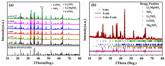 As shown in Figure 2a, the CaTiO3 phase existed in the ceramic systems in the form of the secondary phase without reaction with other phases. Rietveld refinements using Fullprof software were introduced to confirm the weight percentage and the theoretical density of each phase in the MLL ceramic without CaTiO3, as shown in Figure 2b. The ion occupancy was revised based on the crystal structures of Li2MgSiO4, SiO2, Li2TiO3, LiTiO2, and Mg2SiO4. The XRD pattern of the MLL ceramic displayed good refinement. The refinement result is shown in Table 1. The theoretical density of the MLL ceramic was calculated according to Equation (1), with a value of about 3.381 g/cm3. As CaTiO3 could not react with the MLL, the theoretical densities of the MLLC ceramics could also be calculated according to Equation (1).