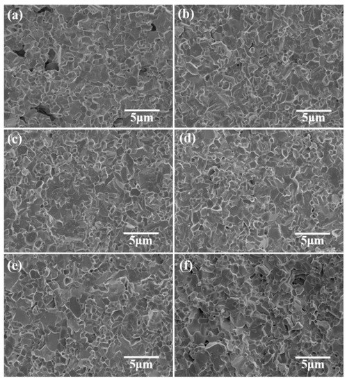 The crystal structures and microstructures of all the samples were examined by X-ray diffraction (XRD, SmartLab 3 KW, Rigaku, Tokyo, Japan) and scanning electron microscopy (SEM, Regulus8100, Hitachi, Tokyo, Japan), respectively. The elemental analysis used energy-dispersive X-ray spectroscopy (EDS) included in the SEM. The volume densities were obtained according to the Archimedes method, and the theoretical densities (Dt) were calculated according to Equation (1)