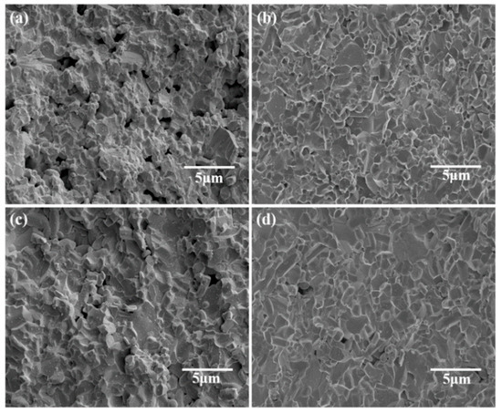 Figure 3 shows the SEM micrographs of the cross-sections of the MLLC ceramics sintered at 800 °C. No grain changes were discovered for any of the samples when increasing the CaTiO3 content. Some pores were detected for the MLL ceramic, and a dense microstructure was detected for all the samples with CaTiO3 additives, which indicated that CaTiO3 additives could promote the densification of the MLLC ceramics. Figure 4 shows the SEM micrographs of the cross-sections of the MLLC9.5 ceramics sintered at different temperatures. The micrograph differences between Figure 4a–d could be due to the breaking of the ceramics, leading to different flatnesses. The grain size of the MLLC9.5 ceramic increased with the increase in the sintering temperature, and some pores were observed in all the samples except for those sintered at 800 °C, indicating that 800 °C was the optimal sintering temperature of the MLLC ceramics.