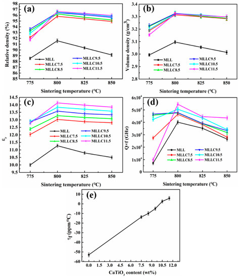 Figure 5 shows the relative densities, volume densities, dielectric constants, Q×fs, and τfs of the MLLC ceramics. All the relative densities, volume densities, dielectric constants, and Q×f values first increased and then decreased with the increase in the sintering temperature and achieved a maximum value in the samples sintered at 800 °C. When the sintering temperatures were higher than 800 °C, the air in the ceramics could not escape in time, and isolated pores remained trapped, resulting in higher porosity [38]. The dielectric constants and Q×f values changed with the relative densities, which indicated that porosity played an important role in the MWDPs. The dielectric constants also varied in the additive amount of CaTiO3 content due to the high dielectric constant of CaTiO3 ceramics (~162) [39]. After adding the CaTiO3 additives, an obvious increase in the relative density, dielectric constant, and Q×f was observed for all the MLLC ceramics, revealing that the MWDPs were improved with the decrease in porosity. The τfs of the MLLC ceramics sintered at 800 °C increased linearly with the increase in the CaTiO3 content. The variation of τfs could mainly be attributed to the CaTiO3 content and described according to the Lichtenecker empirical rule