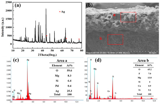 As seen from the XRD pattern of MLLC11.5-40wt%Ag powders sintered at 800 °C in Figure 6a, Ag powders could not react with MLLC11.5 powders and mainly existed in the form of the secondary phase. Figure 6b shows a SEM micrograph of the cross-section of the MLLC11.5 ceramic, whose surface was coated with silver slurry. The ceramic was co-fired at 800 °C for 4 h and displayed a clear interface between the solidified silver slurry and the ceramic, marked as a and b, respectively. Figure 6c,d show the elemental analysis results of areas a and b by EDS, which displayed that areas a and b belonged to Ag and the MLLC11.5 ceramic, respectively. This result indicates that MLLC11.5 ceramics could be suitable for LTCC application.