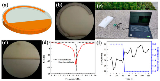 The MLLC11.5 composition was also employed to prepare a GPS antenna composed of a ground plane, radiation layer, and dielectric substrate. The designed sample is shown in Figure 7a. The dielectric substrate was the MLLC11.5 ceramic, about 1.5 mm thick and 21 mm in diameter. The radiation layer was a camber line with a 1 mm width, whose length could be modified to satisfy the GPS frequency (~1.575 GHz). Another part of the front face was the ground plane, which also included a part of the side face and half of the back face of the dielectric substrate. Considering the size limit of the dielectric substrate, the radiation layer could connect with the ground plane through a metal wire with 50 Ω impedance, which could increase the inductance of the antenna to reduce the resonant frequency. The GPS antenna was designed with HFSS software and prepared with the screen-printing process according to the designed size. The front and back face of the GPS antenna is shown in Figure 7b,c, respectively. The metal pattern of the side face was handmade. The soldering was guaranteed by thickening and widening the silver slurry of the solder joint position. Figure 7d shows the return loss (S11) of the GPS antenna. Both the simulated and experimental data of the S11 were less than −10 dB at the resonant frequency. By modifying the length of the radiation layer, the resonant frequency was improved and nearly identical to the simulated data. The GPS signal test was carried out for the antenna by using a hardware system and displayed in the software, as shown in Figure 7e. A total of 11 or 12 Pcs GPS satellites were detected at the same time and displayed more than a 28 dBHz carrier-to-noise ratio (C/N0) on average, indicating antenna application [40].