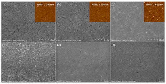 In this paper, the alumina residual layer, originating from the removed naturally oxidized Al film, was the seed layer for the ALD process. The Al films with different thicknesses of 2 nm, 5 nm, and 10 nm were first grown on the graphene surface, and then exposed in air to form self-oxidized Al2O3. The surface morphologies were analyzed by SEM and AFM, respectively (seen in Figure 2a–c). Owing to the high mobility, the aluminum atoms on the graphene surface tend to form island clusters. Hence, a large number of pinholes and cracks were observed in the seed layer, which was formed by a 2 nm Al film on graphene. However, the coverage of the seed layer can be improved as the thickness of the Al film increases. Such improvement is even more notable on the 10 nm seed layer, as shown in Figure 2c. The root mean square (RMS) roughness values of the 2 nm, 5 nm, and 10 nm seed layer surfaces were measured by AFM, which were 1.192 nm, 1.108 nm, and 1.61 nm, respectively. The lowest roughness was found on the 5 nm seed layer surface, which can be attributed to the effect of increased alumina coverage being greater than the effect of the increased crack depth. As the thickness of the seed layer increased, the size of the alumina clusters also gradually increased, which meant that the surface of the seed layer presented the highest roughness at 10 nm. The 10 nm Al2O3 film was further deposited on each seed layer by the ALD process. The surface morphologies of the final dielectric films are shown in Figure 2d–f. It can be found in Figure 2d that, for the 2 nm seed layer, the obtained dielectric is inhomogeneous, and a large number of pinholes can be observed on the film surface. However, it can be seen from Figure 2e,f that closed dielectric films can be obtained on the seed layers of 5 nm and 10 nm, which is mainly attributed to the increased coverage of the seed layer. Therefore, the fabrication of graphene transistors requires aluminum films at least 5 nm thick as seed layers for the standard Al evaporation methods.