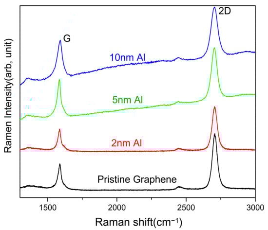 Raman spectra of pristine graphene (black line) as well as the graphene after deposition of 2 nm (red line), 5 nm (green line), and 10 nm (blue line) Al films by e-beam evaporation and natural oxidation to Al2O3 seed layers in air, respectively.