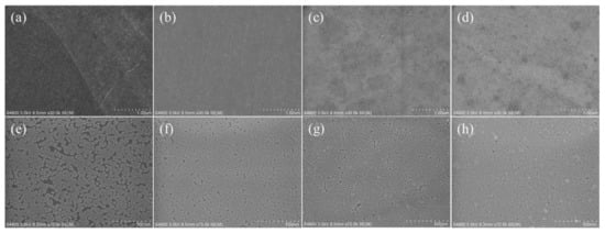 As mentioned previously, the Al2O3 seed layer limits the minimal possible thickness of dielectrics and may also introduce extra scattering centers. In order to avoid this adverse effect, we attempt to remove the Al2O3 seed layer from the graphene surface using an etching solution. The alumina residual provides the nucleation sites for the following ALD process. Solution A (1 partH3PO4:10 part DI water) and solution B (1 part 36% NH4OH:10 part DI water) were used as etching solutions, respectively. Generally, alumina does not react with ammonia, but the ultrathin Al2O3 films can be etched by ammonia solution. Figure 4a shows the graphene surface of 2 nm self-oxidized Al2O3 seed layer etched by solution A at room temperature for 5 min. Figure 4b–d show the 2 nm, 5 nm, and 10 nm self-oxidized Al2O3 seed layers, etched by solution B at the same conditions. It can be clearly seen that the Al2O3 film can be removed by both solution A and solution B. The residues of which would be retained on the graphene surface previously covered by Al2O3. The residues of the self-oxidized Al2O3 films can provide the necessary nucleation sites for subsequent ALD process. The surface morphologies of the residue-seeded Al2O3, treated by solution A and solution B, are shown in Figure 4e,f. It can be seen that the Al2O3 film, deposited on the seed layer, treated by solution B, exhibited higher quality with fewer pinholes compared with that treated by solution A. This may be attributed to the following reason. Because of the more active reaction between alumina and H3PO4 compared with that between ammonia and H3PO4, less residue will be left on the surface of the graphene after the etching process with solution A than solution B. The inadequate enucleation sites meant that the ALD Al2O3 film deposition was of poor quality. The effect of the removed seed layer thickness on the Al2O3 dielectric layer was further investigated. The graphene samples covered with 5 nm and 10 nm Al2O3 seed layers were etched by solution B. Then, the 10 nm ALD Al2O3 layer was deposited on the graphene. Figure 4f–h show the SEM images of the surface morphology of the Al2O3 dielectric layers for different thickness seed layers etched by solution B. The number of pinholes decreases as the thickness of the removed seed layer increases. The residues left after the removal of the 10 nm self-oxidized alumina seed layer can provide enough nucleation sites for the subsequent ALD process and lead to a good uniformity of Al2O3 film. However, the number of particles that are not completely removed also increases with the thickness of the seed layer, which may lead to an increased roughness of the dielectric film.