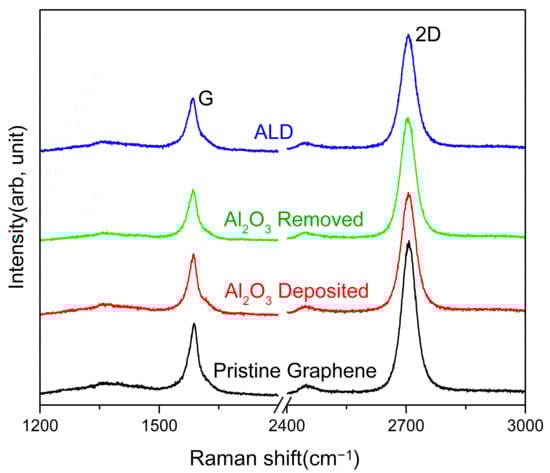 Raman spectra further confirmed that no extra defects were generated in the graphene with the seed layer etching process. Figure 5 shows the Raman spectra of graphene for different process steps during the deposition of the dielectric film. For the pristine graphene transferred to the SiO2/Si substrate, the G and 2D peaks in the Raman spectra are located at 1587 cm−1 and 2708 cm−1, respectively. Usually, the G and 2D peaks of graphene are at 1580 cm−1 and 2700 cm−1, respectively. However, the blueshifts of the G peak and the 2D peak of graphene were observed in our sample. The blue shift of the Raman peak indicates increased phonon energy in graphene, which can be attributed to the doping effect originating from the absorption of water in the air during the transfer process [,,,,]. In addition, the intensity ratio of the 2D peak to the G peak (I2D/IG) in the Raman spectra is estimated to be 2.13, which indicates that the graphene in the experiment is a single layer. It can be seen from the figure that a D peak also appears near the position of 1370 cm−1, indicating the presence of point defects or structural disorders in the graphene. The disorders may originate from the wrinkles generated during the transfer process []. After the graphene surface was covered by the 2 nm Al2O3 film, deposited by electron beam evaporation, the intensity of all peaks in the Raman spectra became weaker. The 2D peak shifted left, to the position of 2705 cm−1.The redshift of the 2D peak may be due to the electron doping of graphene caused byAl2O3 film. The extra electrons mainly originate from the negative charge induced in graphene by Al3+ in alumina. After the etching of 2 nm Al2O3 by solution B, the position of the 2D peak in the corresponding Raman spectra shifted right to 2706 cm−1, but it was still lower than 2708 cm−1 in the original graphene. The result suggests that some residues of Al2O3 still existed on the graphene surface. It should be noted that the intensity ratio of the D-peak to the G-peak (ID/IG) in the Raman spectra of graphene did not change significantly before and after the etching process, which indicates that the graphene was not damaged and reserved its original properties. The subsequent ALD deposition made the position of the 2D peak shift slightly left again, to 2705 cm−1.