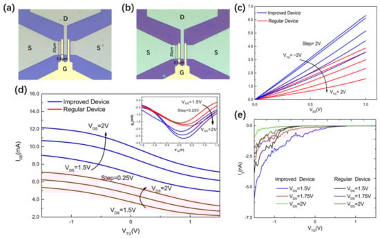 The electrical characteristics of both graphene transistors were measured by the Keithley 4200 semiconductor parameter analyzer at room temperature. Figure 6c shows the output characteristics of top-gate graphene transistors fabricated by the improved (blue line) and regular (red line) processes, respectively. The drain voltage (VDS) scanned from 0 V to 1 V. The top-gate voltage (VG) swept from −2 V to 2 V. It can be observed that the drain currents of both devices showed almost linear correlation with the drain voltages, and no current saturation occurred in the measured ranges. The linear relationship between IDS and VDS was attributed to the zero-gap band structure of the graphene. However, in some cases, due to the presence of both carriers in the graphene channel, the drain current will first enter saturation, and then enter the secondary linear region, which is known as the “kink” effect []. When the drain voltage is kept constant, the drain current of both devices decreases as the gate voltage increases. This is because when the gate voltage is in the range of −2V to 2V, the graphene transistor works in the branch of the hole conducting, and the number of hole carriers decreases gradually with the increase gate voltage. Under the same conditions, the drain current of the improved device was significantly larger than that of the regular device. The increasing drain current of the GFET fabricated by improved dielectric deposition method can be attributed to the enhanced gate control capability induced by the thinner dielectric film. Benefiting from the enhanced gate control capability, the number of carriers in the graphene channel increased. Figure 6d shows the transfer characteristics of top-gate graphene transistors prepared using the improved (blue line) and regular (red line) processes at different drain biases of 1.5 V, 1.75 V, and 2 V. Generally, the transfer characteristic curve of a standard GFET presents a “V” shape. The conductance of GFET in the positive direction of the curve is controlled by electrons, while that in the negative direction of the curve is controlled by holes []. However, our GFET only showed the hole branch in the measurement range. This indicates that our GFET was p-type doped, which can be attributed to the photoresist residue and water adsorption on graphene.