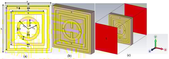 The parametric description of the proposed unit cell demonstrated in Figure 1a is a new arrangement of two square ring resonators with double-epsilon-shaped metal strips. Figure 1b illustrates the perspective view of the unit cell while Figure 1c shows the simulation setup.
