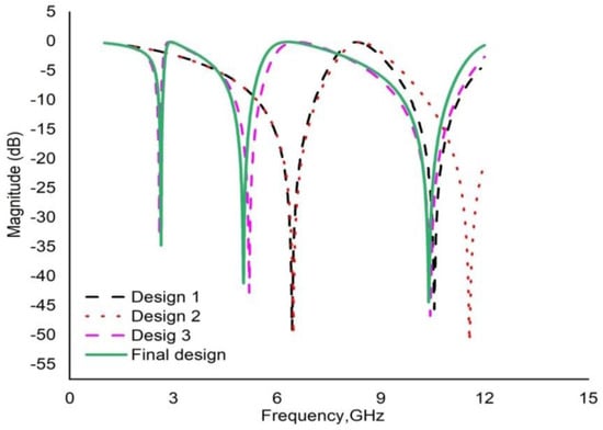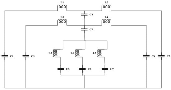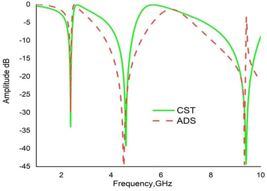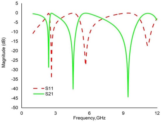 Figure 11 represents a predictable equivalent circuit for the proposed metamaterial unit cell. In the equivalent circuit L1, L2, L3, L4, L5, L6 and L7 depict the inductors while C1 to C9 represent the capacitors. The equivalent circuit for the proposed unit cell was performed using the advanced design system (ADS) software. The first SRR is represented by the inductors L1, L2 and capacitors C1, C2, respectively, which belong to the first resonance frequency of 2.375 GHz. Similarly, L3, L4 and C3, C4 are used for the second SRR, contributing to the second frequency of 4.52 GHz. Meanwhile, the two epsilon-shaped resonators are replaced by the inductors L5 to L7 and the capacitors C5 to C7, which are responsible for the third resonance frequency of 9.35 GHz, where C8 and C9 are the coupling capacitors. The values of all inductors and capacitors are tabulated in Table 3. The two transmission coefficients (S21) for the unit cell extracted from CST and ADS are presented in the Figure 12. Based on Figure 12, the 3 resonance frequencies that were attained by ADS simulation are 2.375 GHz, 4.52 GHz and 9.35, whereas the CST-simulated frequencies were 2.38 GHz, 4.55 GHz and 9.24 GHz, indicating very negligible disparity.