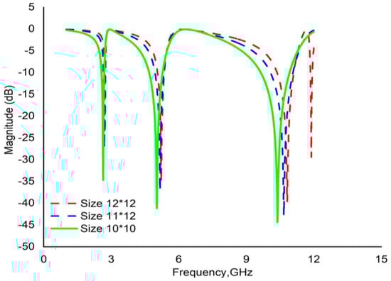 Different sizes of unit cell were also investigated to select the best dimension. The unit cell of three different sizes (10 mm, 11 mm and 12 mm) with the same thickness (1.524 mm) as the substrate (Rogers RT6002) were designed by keeping other components unaltered. The numerical results are demonstrated in Figure 4. It is evident from Figure 4 that the sizes of 11 mm and 12 mm exhibited 3 resonances at nearly the same frequency with a lower bandwidth, which is quite low compared to the 10 mm unit cell. On the other hand, the 10 mm unit cell exhibited 3 major resonances at 2.38 GHz, 4.55 GHz and 9.42 GHz. Therefore, finally the 10 × 10 × 1.524 mm3 dimension was selected for the projected metamaterial unit cell.