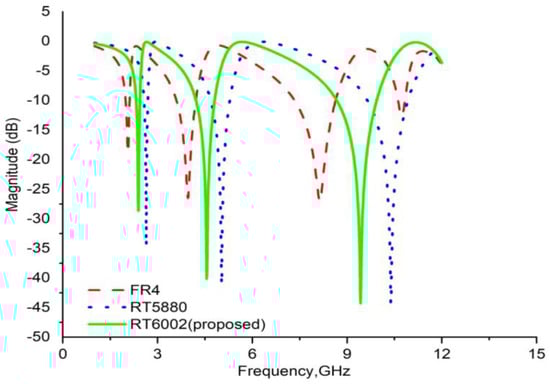 An analysis is carried out to select the appropriate dielectric for the substrate of the metamaterial unit cell, which is shown in Figure 5. Two Rogers dielectrics, namely, RT 5880 and RT 6002, together with a flame-retardant dielectric FR4, were separately investigated to observe their responses. RT5880 and FR4 produced three resonance peaks with narrow bandwidths. Contrarily, Rogers RT6002 (dielectric constant 2.2 and loss tangent 0.0012) yielded tri-resonance peaks and adequate bandwidth covering the S-, C- and X-bands with higher EMR 12.61. Hence, the proposed unit cell was designed on Rogers RT6002 (lossy) substrate.