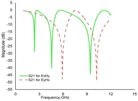 A regular technique was also employed to assess the effect of the changing transmission coefficient (S21) for varying field propagations. The simulation setup for the changed electric and magnetic fields is depicted in the Figure 6. The electric field (Ey) was applied along the Y-axis while the magnetic field (Hx) was applied along the X-axis. Two resonances that were recorded around 6 and 10 GHz.