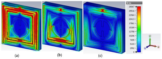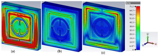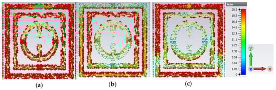 The induced magnetic field intensity (B) depends on the current flow (I) or charge flow and the distance (r) of the conductor, which can be expressed using Biot–Savart’s law, [], where is the permeability in free space. With the increase in the current flow, the strength of the magnetic field also increases. The same effect is also observed in the E field, as presented in Figure 8. When the electric field pattern (Figure 8) is compared to that of the H field presented in Figure 9, it can be observed that the electric field (E) decreases when the magnetic field becomes positive. This changing pattern of the H and E fields support Equations (6) and (7). Moreover, it is also found that the electric field intensity was high in the split gaps as the splits in the resonator function as of capacitors.