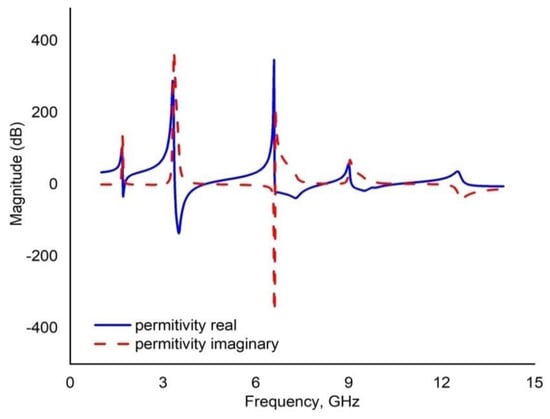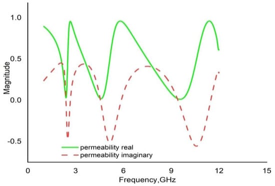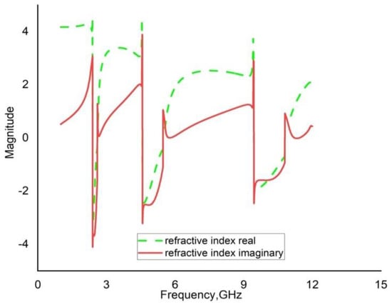 As mentioned earlier, the PEC and PEM boundary conditions were applied along the X-axis and Y-axis, while the EM radiation was applied to the Z-axis to simulate the unit cell within the frequency range of 1 GHz to 12 GHz. Three vital material characteristics—permittivity (), permeability and refractive index (nr)—were derived through the Nicolson–Ross–Weir (NRW) technique [] to realize the EM properties of the MMs. Popularly used MATLAB code is established in the context of Equations (1)–(5). After the execution, the attained results were verified with the CST results: