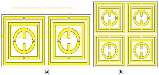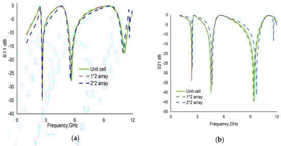 A unit cell itself cannot satisfactorily function independently. To obtain the expected electromagnetic properties from a metamaterial, an array of the unit cell was used. The 1 × 2 and 2 × 2 arrays of the proposed unit cell with the same substrate material are illustrated in the Figure 17a,b. To investigate the coupling effect among the proposed unit cell for different orientations of an array, a parametric study was performed whereby it generated an almost similar response as S21 to the unit cell. Therefore, the efficiency of the array was also observed. Figure 18a,b present the statistical results of S11 and S21, respectively, by CST of arrays with the proposed unit cell. By assessing the simulated results of the arrays, a change in the resonance frequencies was observed for the new array metamaterial. A comparative view of three resonance frequencies of two arrays in addition to the unit cell is shown in Table 4. The third frequency (9.42 GHz) is shifted nearly 2%, while the other 2 frequencies (2.38 GHz and 4.55 GHz) shifted only by 1%.