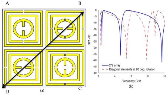(a) 2 × 2 array of diagonal elements for 90° rotation; (b) Comparison of S21 results. A, B, C and D are the four positions of unit cell in the 2 × 2 array.