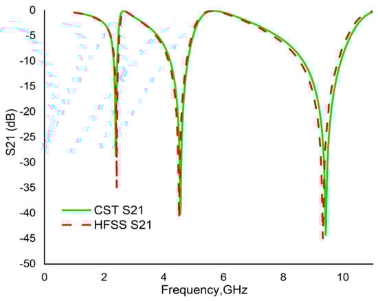 Comparison of transmission coefficient (S21) by CST and HFSS results.