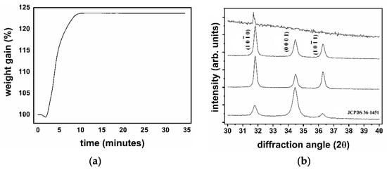 (a) Isothermal TGA analysis of metallic Zn at 500 °C; (b) XRD results: changes in the position and breadth of the main Bragg peak indicate a tuning of the on-axis preferential crystallographic orientation, as well as of the average size of the ZnO nanocrystals.