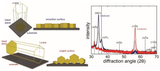 Schematic representation of the geometrical configurations and their corresponding X-ray diffraction patterns of c- and a-textured ZnO films. Adapted with permission from ref. []. Copyright Year 2014 Elsevier.