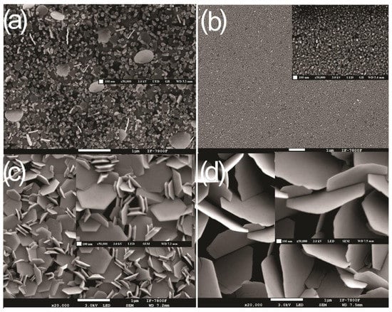 Micrographs of the Zn films, obtained with SEM under a fixed resolution (×50,000 for the inset figures). Four different samples with different average particle sizes: (a) A1 (50 nm); (b) 3 M (250 nm); (c) 6 M (350 nm); (d) 10 M (850 nm).