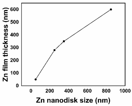 In the present investigation, no explicit evaluation of the roughness of the films is carried out. However, based on Figure 3, it can be indirectly stated that roughness tends to enlarge as the films thicken. The overall influence of the roughness of the Zn films on the final characteristics of the ZnO films can be deduced based on the initial thickness of the Zn films. In turn, the latter is critically influenced by the average size of the deposited nanodisks, as is shown by the nonlinear relationship in Figure 4.