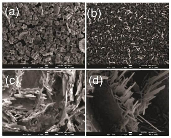 After Jaber and Laanab (2014), it is believed that an excess of thermal energy drives particle growth in the (0001) direction [], as usually observed in the growth of ZnO. This point can be readily seen by the aid of the scanning electron microscopy (SEM) images shown in Figure 5. Whereas the supplied energy is mainly utilized in the growth of ZnO walls on the edges of the Zn particles for thicker Zn metallic films possessing larger nanodisks, for thinner films with smaller nanodisks, some of the surplus energy is utilized for the growth of ZnO along the normal to the edges as well. The morphology of the particles constituting the ZnO films is influenced by the initial morphology of the Zn nanodisks. Oxidation is favored at the vertices for the smaller Zn disks (Figure 5a), resulting in a ZnO nano-gearwheel. In the case of 3MOx (Figure 5b), both the density and the diameter of the disks increase, driving the growth of a nano-rice morphology with the axis of growth in the direction (100). ZnO needles supported on the edges of the precursor Zn nanodisks are formed, also in the direction (100), when the latter increase further in size (Figure 5c,d). The shape of the hexagonal plates is preserved.