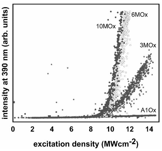 To prove the importance of this scattering effect, preliminary measurements of random lasing were performed as described in the Materials and Methods section. Figure 6 shows the intensity of the photoluminescence signal centered at 390 nm, as the pump energy is varied. In the figure, it is apparent that the signal begins to increase nonlinearly with the pumping intensity after the physical instance for the detected intensity, i.e., the lasing threshold. The signal increases more significantly for samples 6MOx and 10MOx due to stronger scattering effects compared to those featured in the other two thinner films. The present results bolster the reported convention that thicker ZnO films with a-PCO are characterized by rougher surfaces.