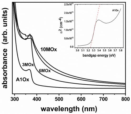 Lastly, a final comment is given regarding the possible role of optical scattering on the bandgap shifting. By close inspection of Figure 7 in the visible regime (400–700 nm), it can be noticed that stronger scattering interactions contribute to higher absorption rates, with perhaps optical extinction being a more suitable term. Both glass and ZnO films are highly transparent, so that if not for the non-negligible scattering of photons, all the samples would show a common absorption baseline in this regime, as is the case for sample A1Ox. The effect should be intensified near the ultraviolet region for the same reason humans see a blue sky. No clear mechanism for the spectral shifting based on the very same arguments can now be envisioned. Absorption and scattering are extensive parameters that add up unequally to the overall optical extinction. In principle, if the intensity or strength differences are minimal between two close interactions, within a ±Δλ range which is additive, they overlap, resulting in spectral shifting. In other words, perhaps the strength of the optical scattering addressed to samples 6MOx and 10MOx is comparable to that of their optical absorption, so that it contributes to the large bandgap shifting registered in Table 2.
