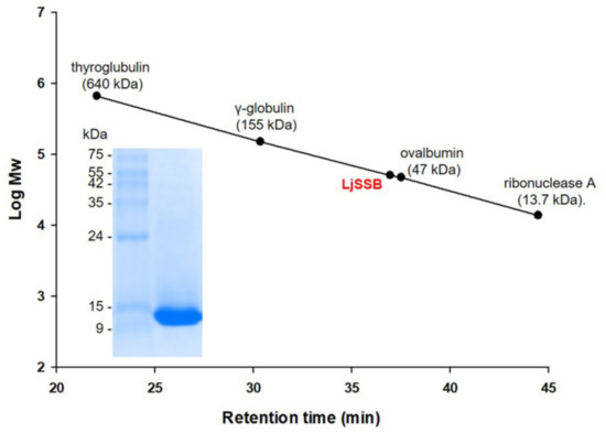 SSB proteins have a variety of oligomeric states, ranging from monomers to pentamers [26,27,28,29]. In the case of bacterial SSBs, mesophilic SSB function as homotetramers with a single OB-domain subunit. Thermophilic SSBs from bacteria, such as Deinococcus radiodurans and Thermus aquaticus, exist as homodimers. Analytical gel filtration was performed to determine the oligomeric status of the proteins in the solution. The elution profile relative to standard proteins indicated that the native molecular mass of LjSSB was approximately 50 kDa, which is nearly four times the molecular mass of the LjSSB monomer (12.6 kDa) (Figure 2). Since the molecular mass of LjSSB is 50.4 kDa as calculated from its amino acid composition in the case of homotetramers, the result implied that LjSSB existed as a stable homotetramer in the solution.